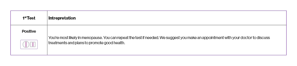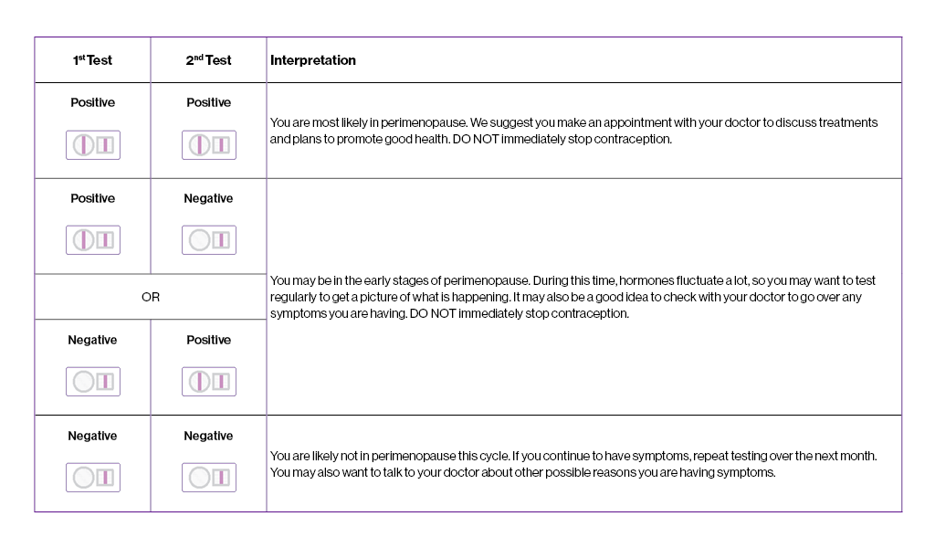 If you are still getting monthly periods, take the e.p.t. Menopause Test during the first week of your cycle between days 2 – 7. If your result is negative but you’re still having symptoms, take a second test 1 week later.